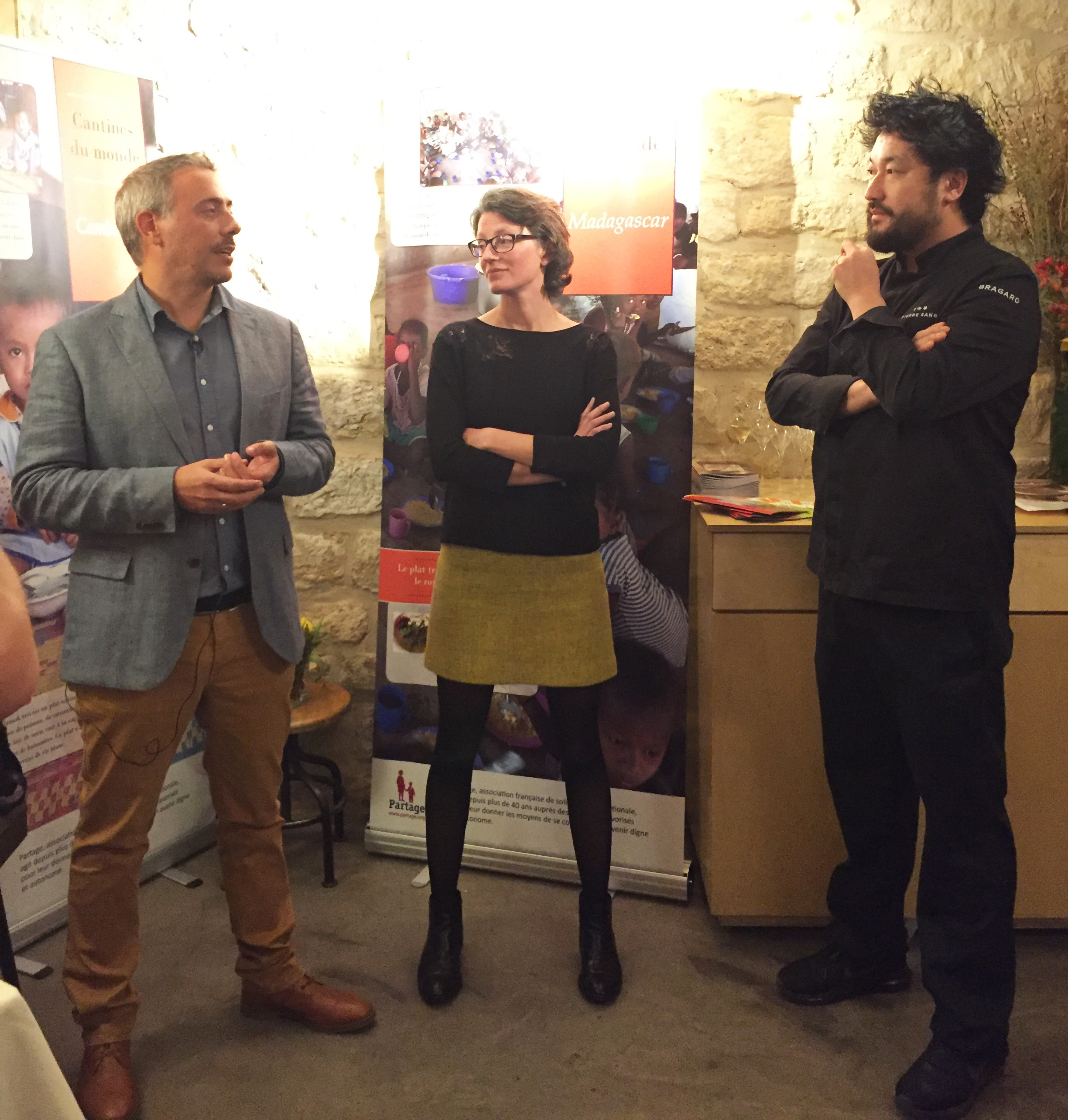 Sur la photo de gauche à droite : Nicolas Lenssens, Directeur général de Partage, Anne-Laure Narcy, Responsable du réseau bénévole et éducation en développement et Pierre-Sang Boyer, Chef et Ambassadeur de l’événement Cantines du monde.